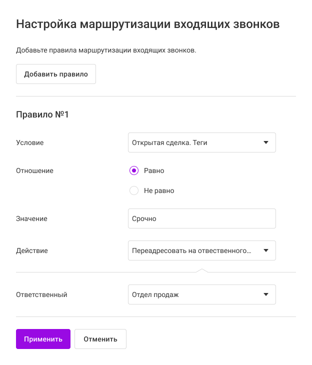 Умная маршрутизация автоматически направляет входящий звонок нужному сотруднику или отделу, используя теги из карточки клиента, компании или сделки, а также учитывает рабочее время. Вы можете гибко настроить маршрутизацию под свои задачи.