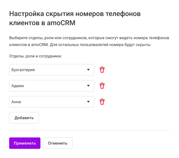 Вы можете скрыть от сотрудников номера телефонов клиентов, чтобы сохранить базу контактов в безопасности, не нарушая рабочий процесс. Номера будут замаскированы с помощью «*”.