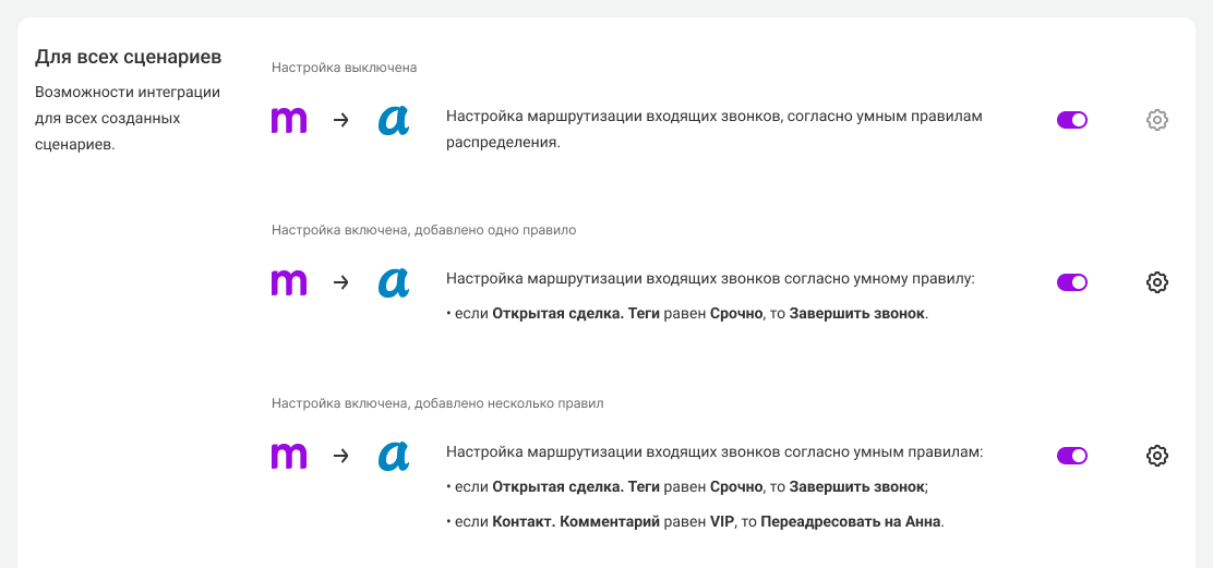 Теги будут учитываться при умной маршрутизации входящих звонков. Система будет направлять вызовы определенным сотрудникам или отделам, ответственным за работу с клиентами с соответствующими метками. Чтобы маршрутизация заработала добавьте соответствующие правила в настройках сценария во вкладке «Интеграции с CRM» — «amoCRM» — «Настройка маршрутизации входящих звонков, согласно умным правилам распределения».
