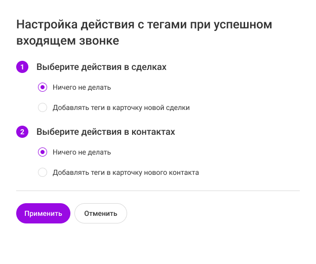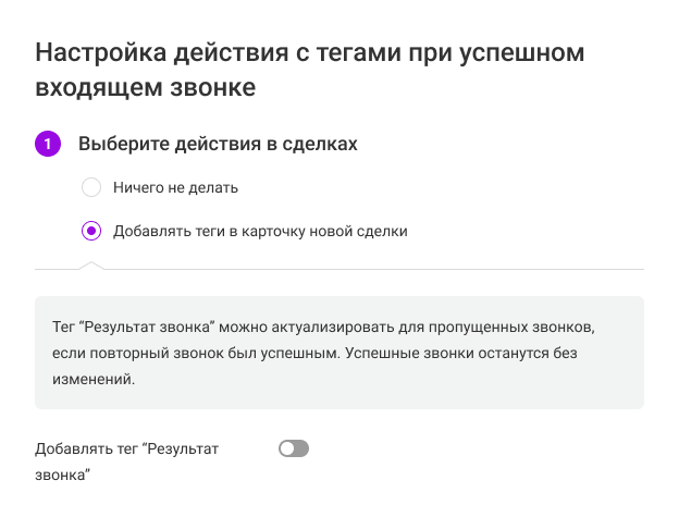2. В открывшемся окне выберите, что делать при успешном входящем звонке: добавлять теги в сделки или контакты или не добавлять.