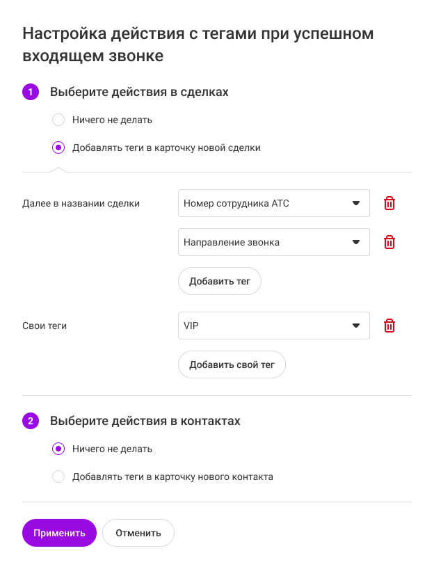 Добавление тегов для сделок и контактов настраивается отдельно друг от друга.