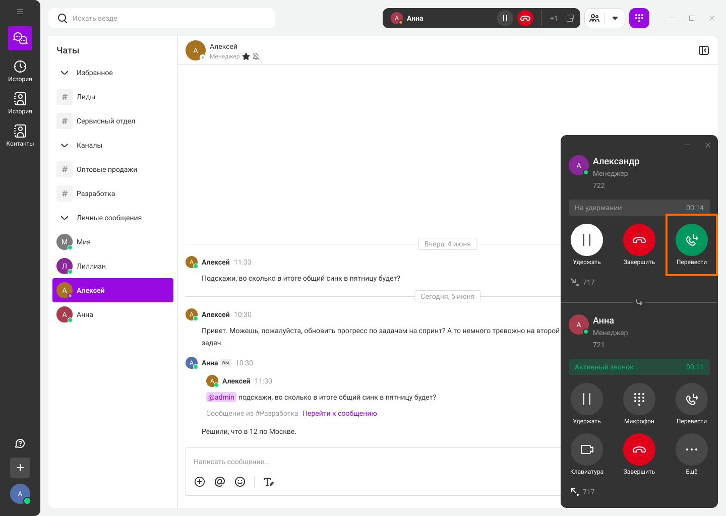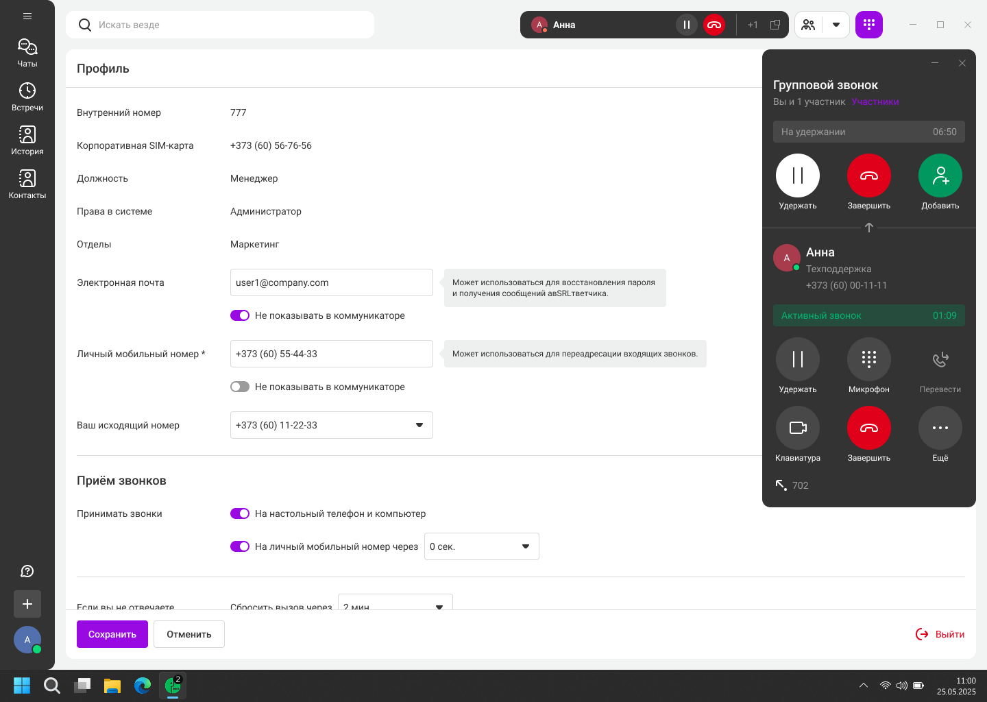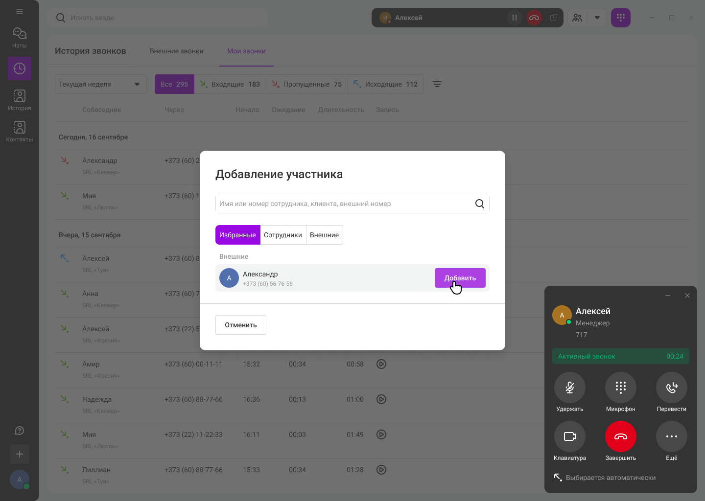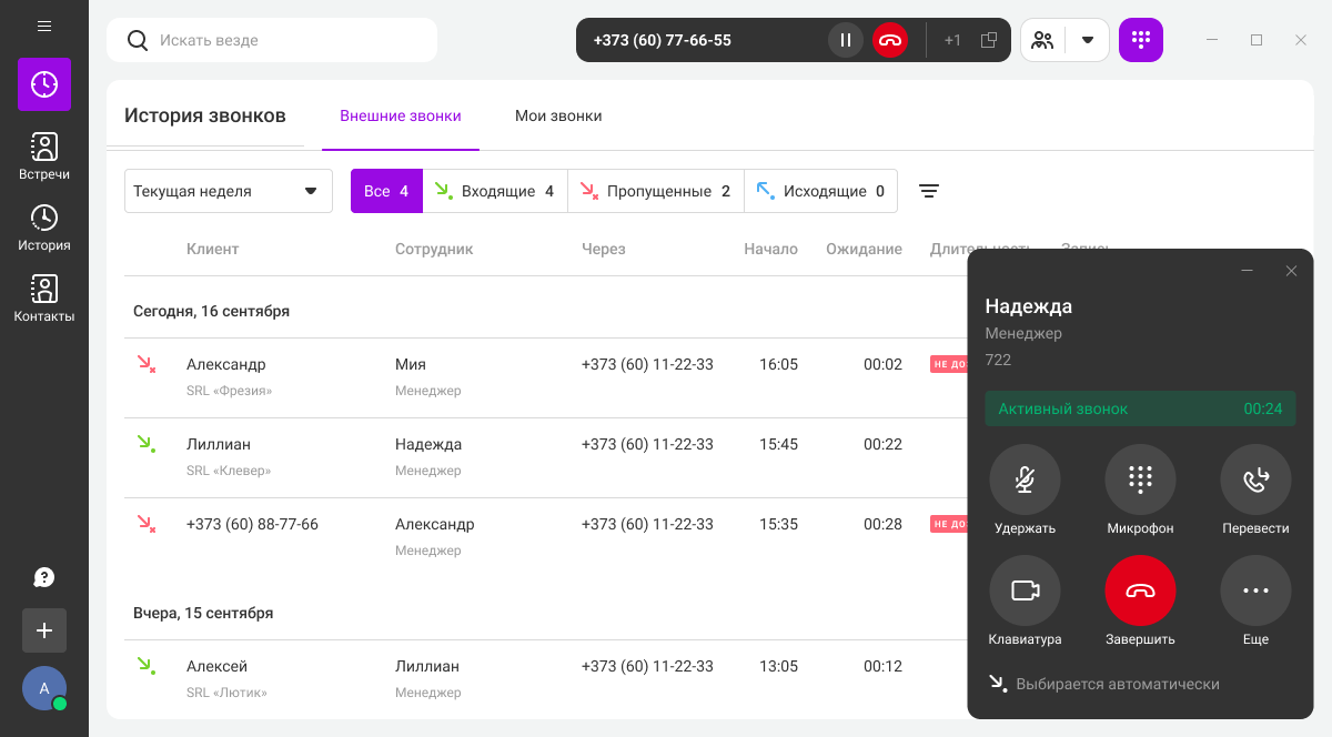 Карточка вызова открывается в отдельном окне, не мешая вам работать с другими приложениями. В карточке звонка доступны все основные функции: удержание, перевод, отключение микрофона, добавление участников в звонок.