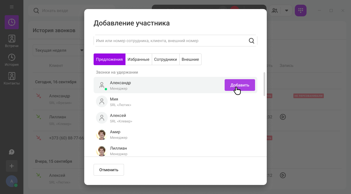Если у вас есть параллельные вызовы, то при попытке перевода или добавления участников в звонок, они отобразятся на вкладке «Предложения» — так удобнее переключаться между несколькими звонками.