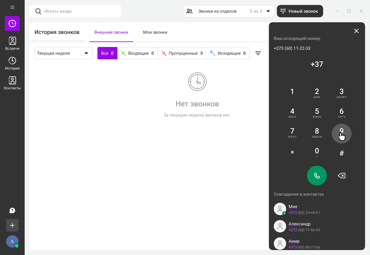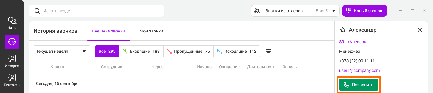 Если у вас пропущенный от клиента и нужно перезвонить как можно скорее, в истории звонков наведите курсор на нужный вызов и нажмите на кнопку «Позвонить» в правой части экрана.