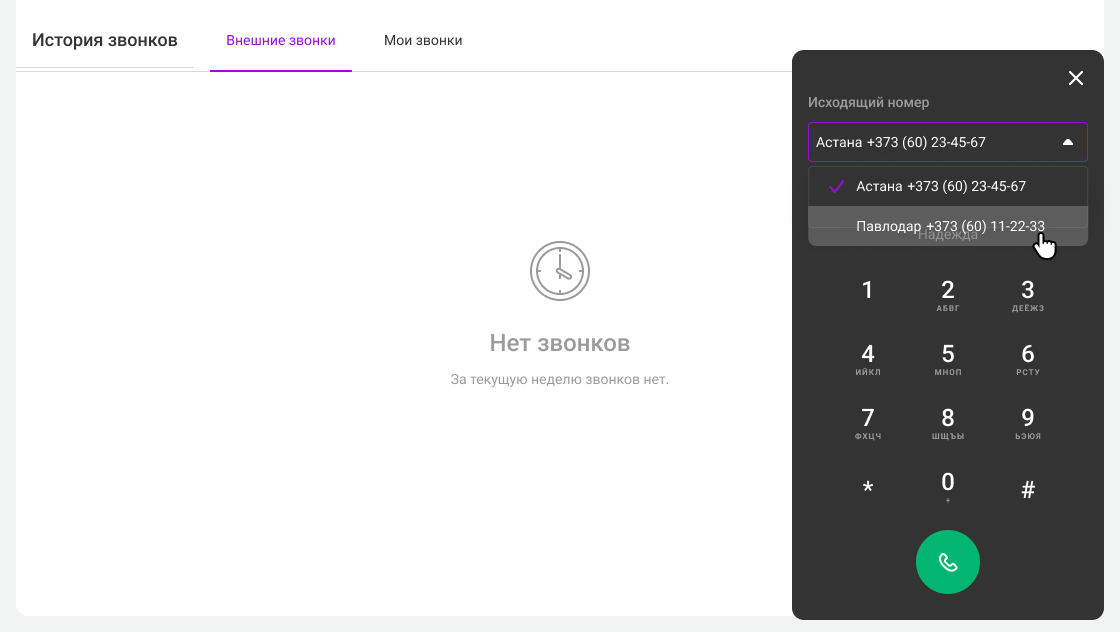Если у вас несколько номеров, при совершении вызова через панель набора номера можно выбрать, с какого из номеров звонить клиенту. Для этого откройте раскрывающийся список в верхней части панели.