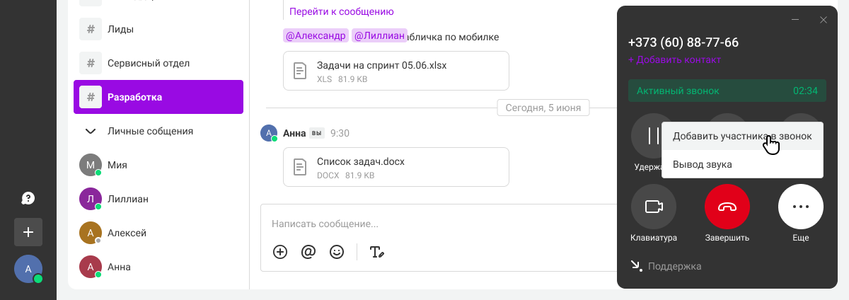 Кроме описанных выше способов совершения вызова, также можно позвонить из окна поиска, из чата с коллегой, из списка участников канала, и из меню по правому клику мышью.