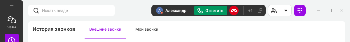 Если не готовы ответить, но не хотите сбрасывать, то можно отключить уведомление о звонке, нажав на колокольчик, и скрыть карточку звонка, нажав на крестик. Даже если карточка звонка скрыта, можно принять звонок через кнопку «Ответить» в верхнем меню корпоративного мессенджера.