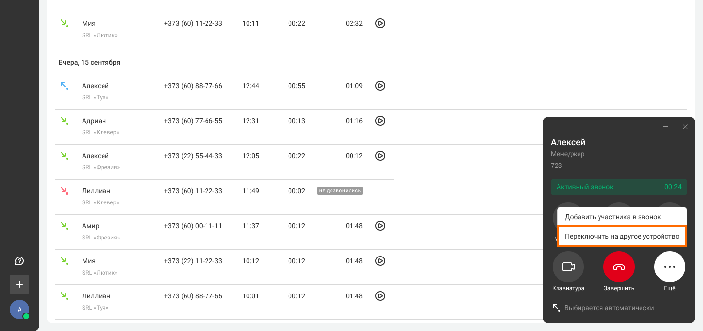 Иногда во время разговора в мессенджере вам нужно покинуть офис. В таком случае можно незаметно для клиента переключить звонок на другое устройство (Call Flip):