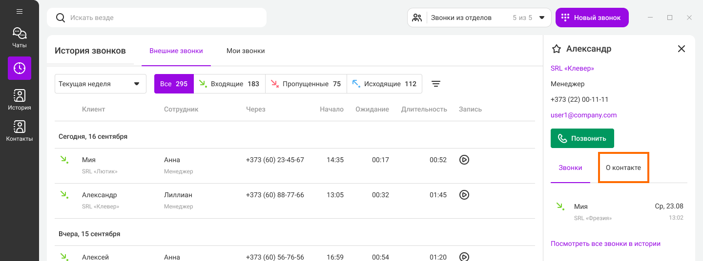 Если у клиента несколько номеров, также из карточки контакта вы можете позвонить на его дополнительный номер. Для этого в карточке перейдите на вкладку «О контакте».