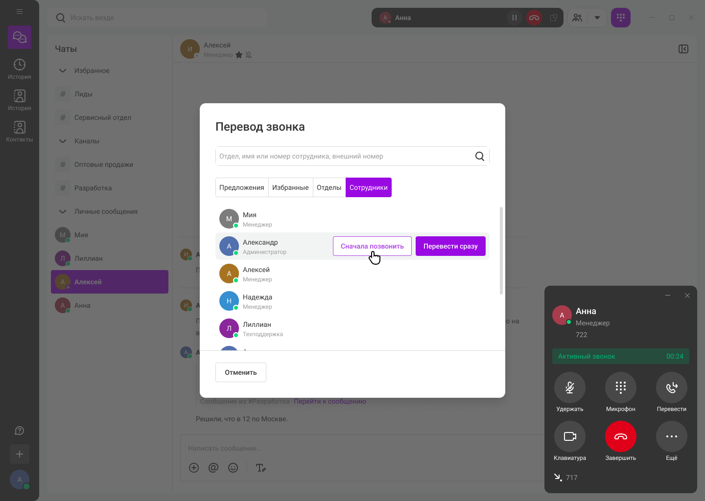 Чтобы перевести вызов, нажмите на кнопку «Перевести» в карточке звонка. Появится окно с вкладками «Отделы» и «Сотрудники». На вкладке «Сотрудники» можно выбрать способ перевода — перевести сразу или сначала позвонить.