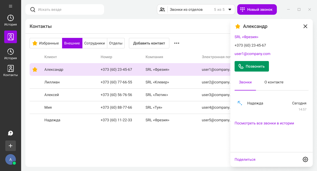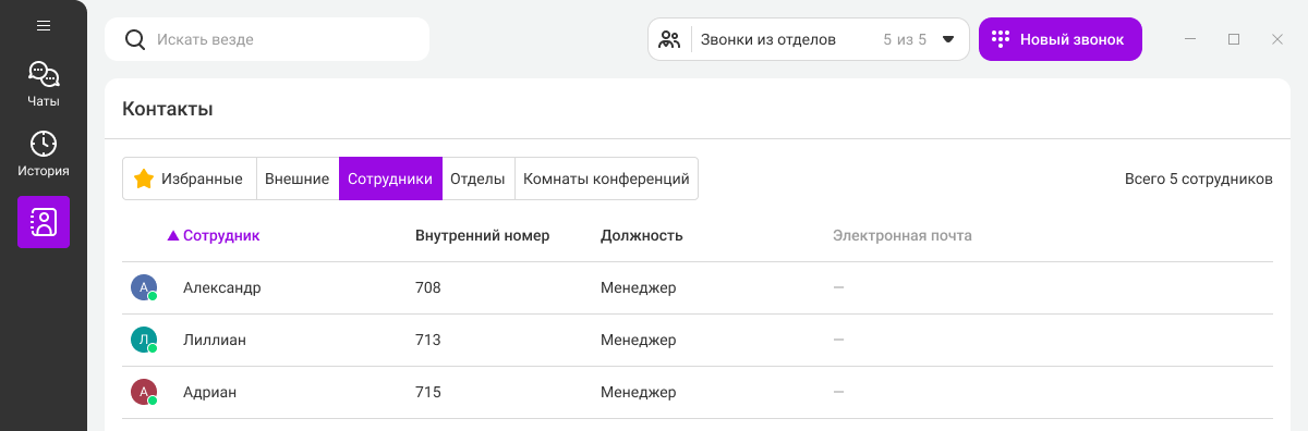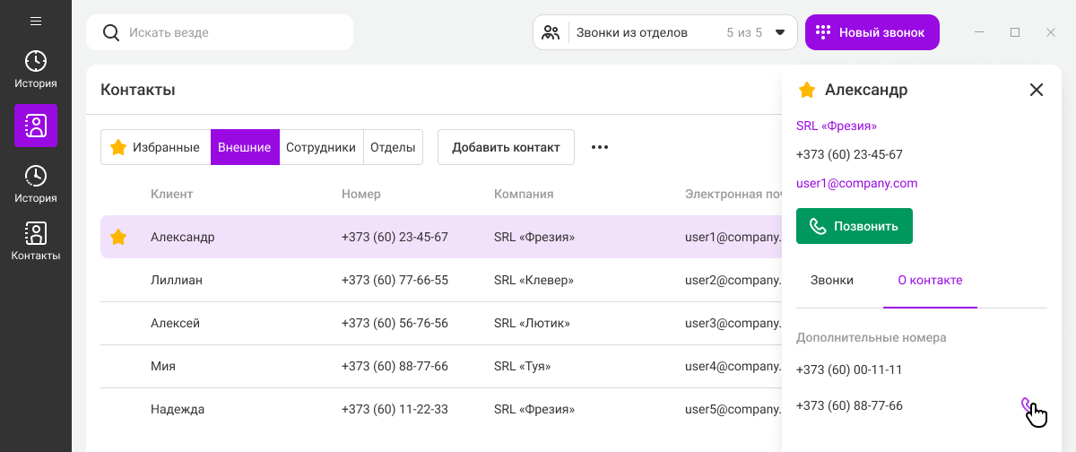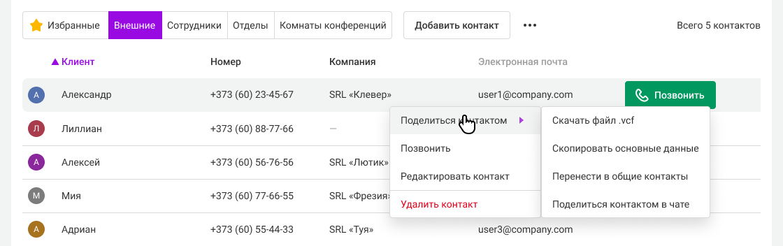 В Корпоративном мессенджере отображаются контакты клиентов и сотрудников. При регистрации сотрудника в АТС его контакт автоматически появляется у всех коллег. Контакты клиентов можно добавлять в мессенджер напрямую, они также доступны всем сотрудникам и синхронизируются с АТС.