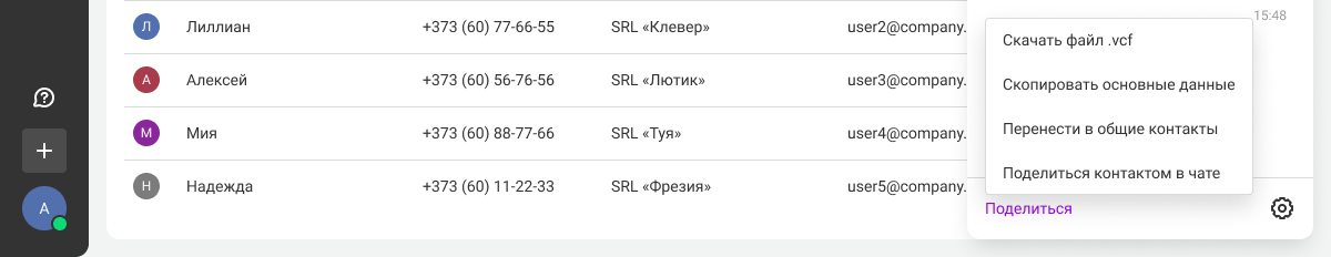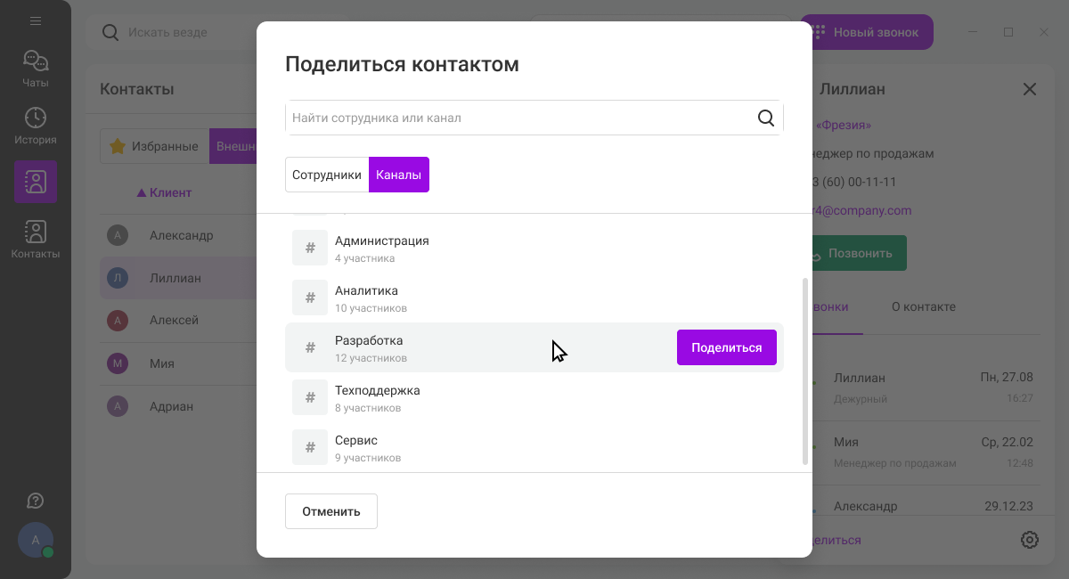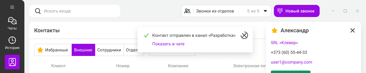 • Поделиться контактом в чате — в чате отобразится краткая карточка контакта с кнопками вызова и отправки сообщения (если это внутренний контакт).
