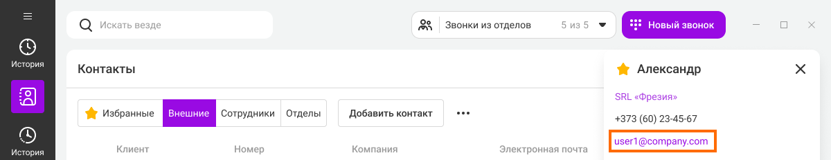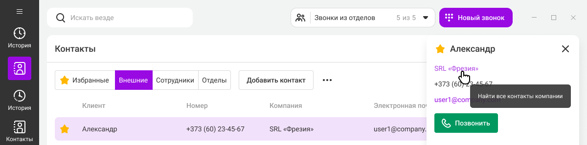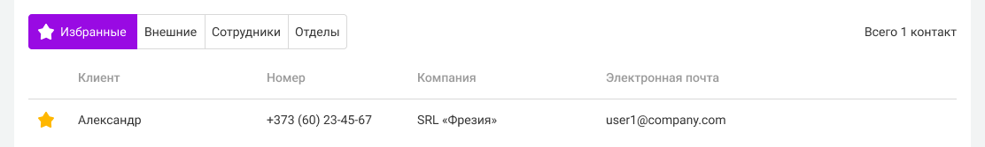 Чтобы найти нужный контакт, в поисковой строке начните писать значение одного из полей: имя, номер, e-mail контакта или название компании.