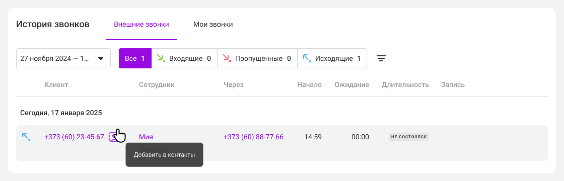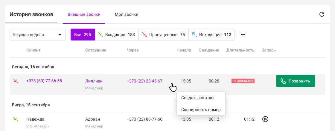 После заполнения данных о клиенте нажмите «Сохранить». Все звонки сохраненного контакта будут автоматически проименованы — его имя будет отображаться в истории.