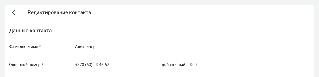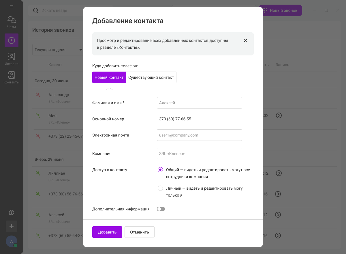 Введите основные данные о клиенте: ФИО, дополнительные телефонные номера, электронную почту, название компании. Также укажите, кто должен видеть этот контакт — только вы или все пользователи АТС.