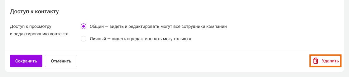 Чтобы удалить созданный вами контакт, в окне редактирования контакта в правом нижнем углу нажмите «Удалить».