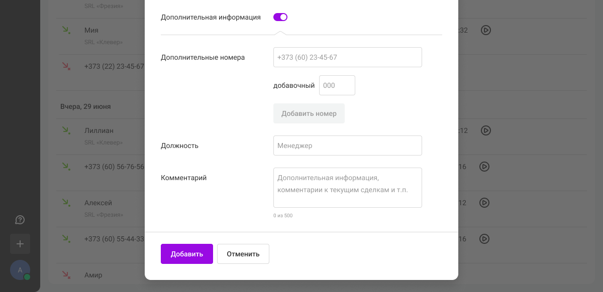 Если вы знаете дополнительный номер клиента, его должность или хотите добавить другие дополнительные сведения, нажмите на переключатель «Дополнительная информация» и заполните поля ниже.
