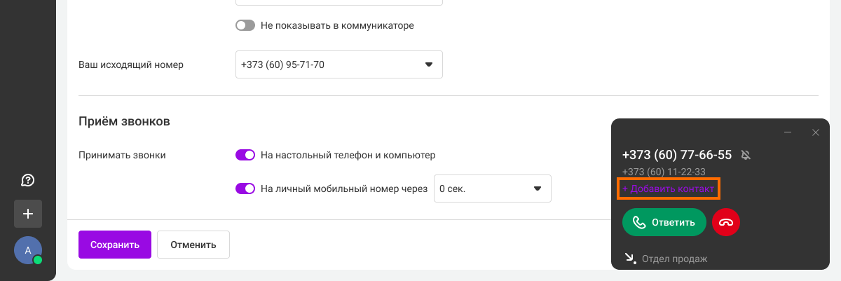 Если вы созваниваетесь с тем, кого нет у вас в контактах, и хотите добавить контакт, не дожидаясь окончания звонка, то в карточке звонка нажмите на кнопку «Добавить контакт».