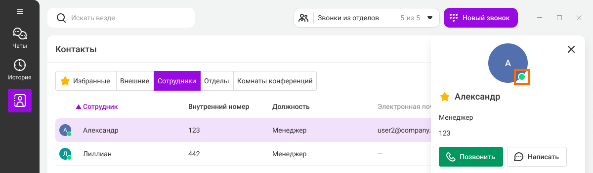 Чтобы узнать, доступен ли коллега для оперативной связи, обратите внимание на статус его присутствия в мессенджере. Этот статус отображается в карточке сотрудника, также его можно посмотреть в списке чатов.