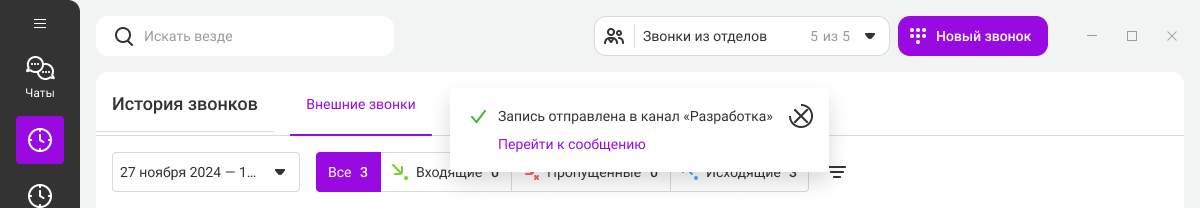 При переходе в историю новый пропущенный звонок подсвечивается красным. Уведомление исчезает, если долго держать вкладку с новым пропущенным открытой или если кто-то из сотрудников перезвонит этому контакту. Чтобы перезвонить по пропущенному, наведите курсор на соответствующую строку и нажмите на кнопку «Позвонить» справа.