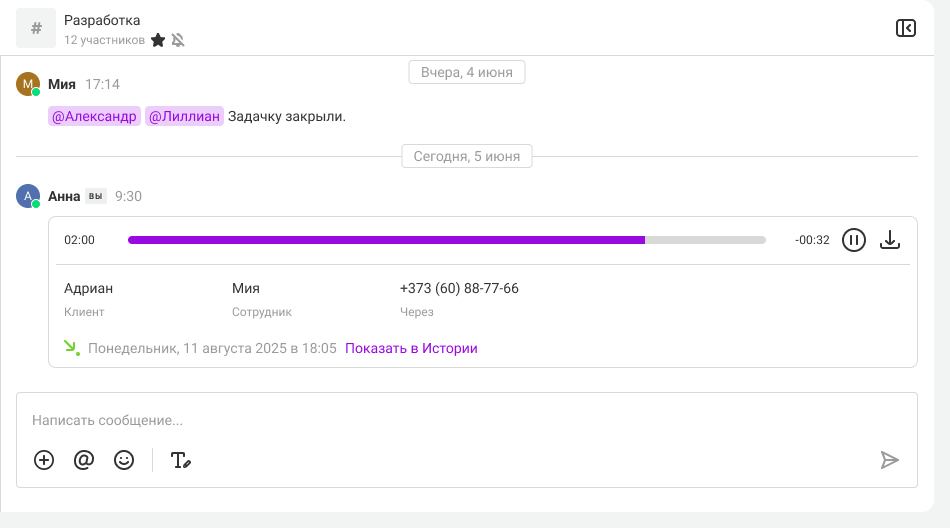 Чтобы поделиться записью звонка в чате, в проигрывателе нажмите на иконку ссылки в правом нижнем углу.
