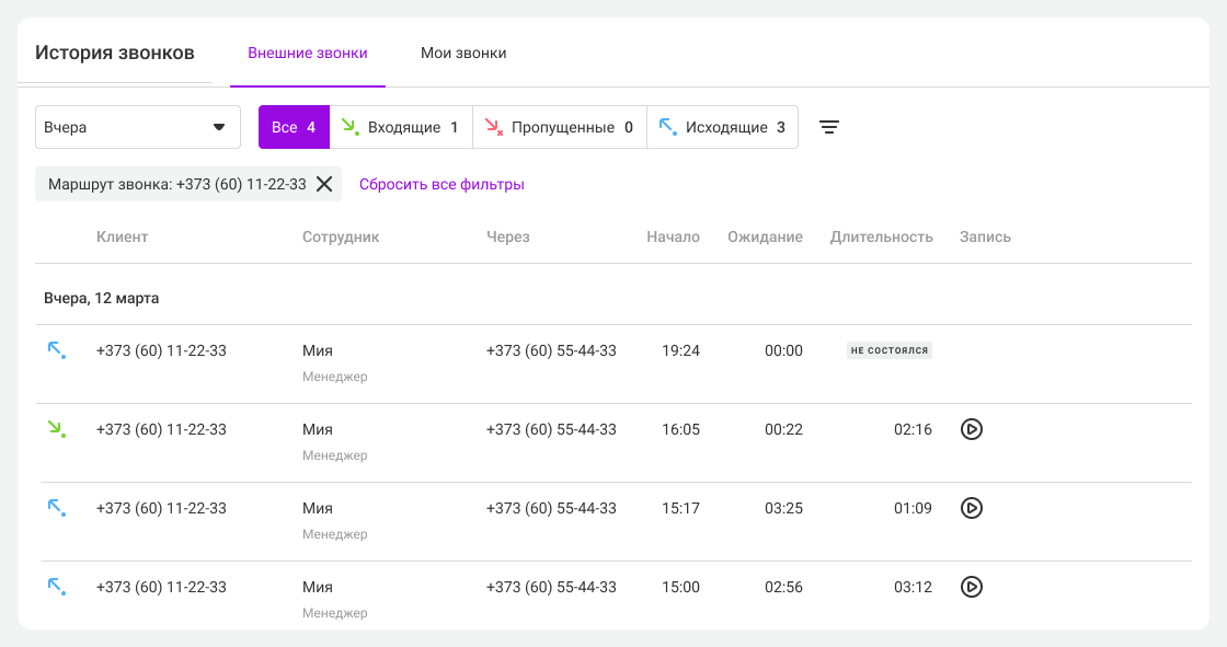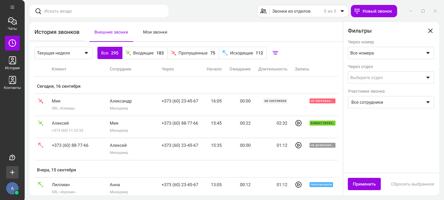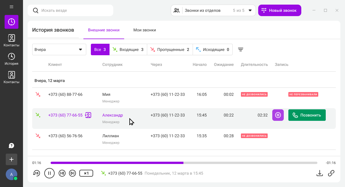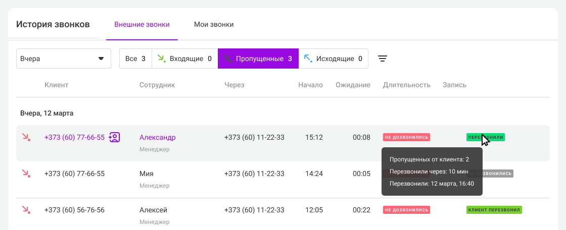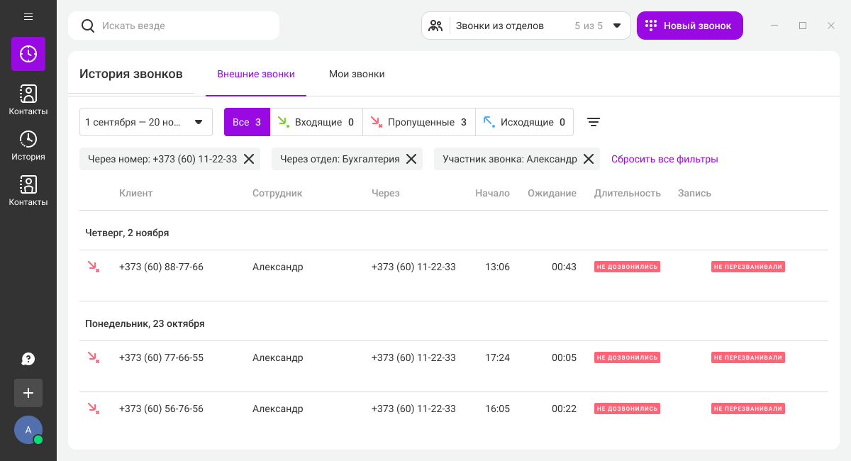 Благодаря фильтру «Контроль пропущенных» вы сможете легко найти непринятые звонки, на которые сотрудники не перезванивали или не дозвонились.