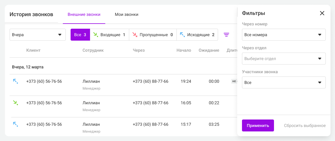 Выберите нужные вам значения фильтров и нажмите «Применить». В таблице останутся только те звонки, которые соответствуют заданным параметрам.