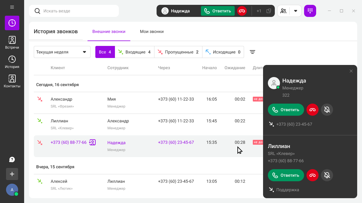В истории звонков вы сможете узнать больше о контакте и быстро ему перезвонить. Гибкая система фильтров помогает найти любой звонок в архиве и при необходимости прослушать его запись.