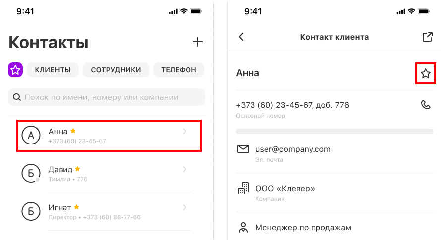 Чтобы добавить контакт в избранное, нажмите на имя контакта в соответствующем разделе, а затем — на звездочку в правом верхнем углу.