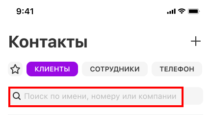 Чтобы найти контакт по имени, номеру телефона или названию компании, воспользуйтесь поисковой строкой вверху экрана.