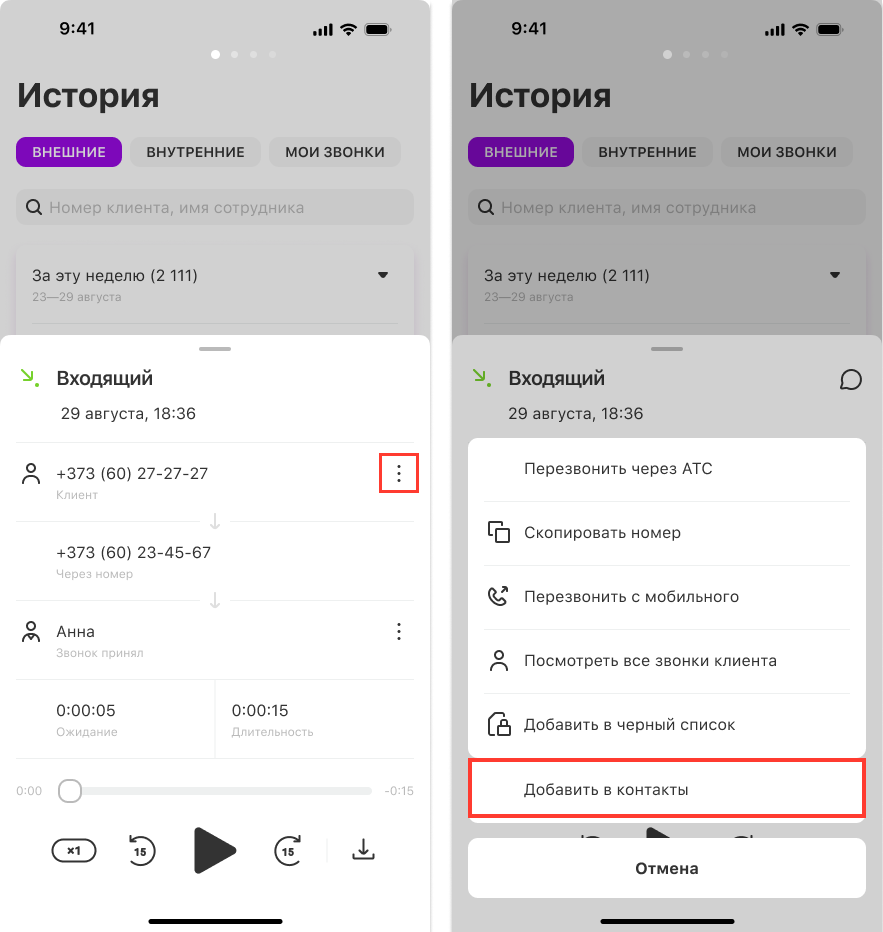 Добавить контакт из истории можно двумя способами: длинным нажатием на звонок и из карточки вызова.