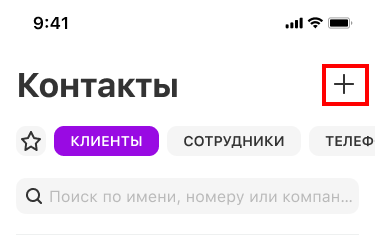 Чтобы добавить контакт, которого нет в истории, перейдите в раздел «Контакты» и нажмите на плюс в правом верхнем углу.