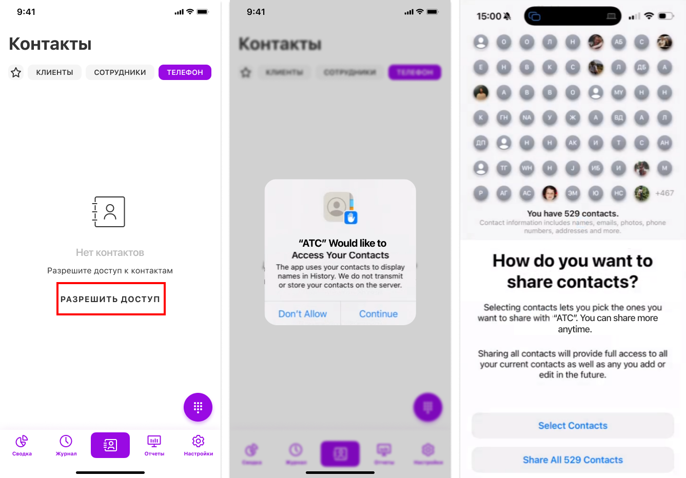 Чтобы добавить контакты со смартфона, на вкладке «Телефон» нажмите на кнопку «Разрешить доступ» . Дальнейшие шаги зависят от типа операционной системы: