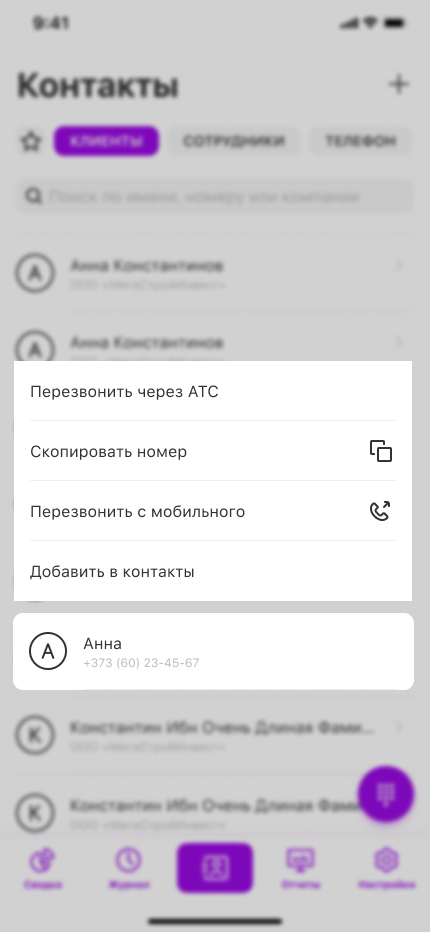 Для удобства контакты разбиты на вкладки «Клиенты», «Сотрудники» и «Телефон» (контакты с вашего устройства). Также контакты, которыми вы часто пользуетесь, можно добавить на вкладку «Избранное» с иконкой звездочки.