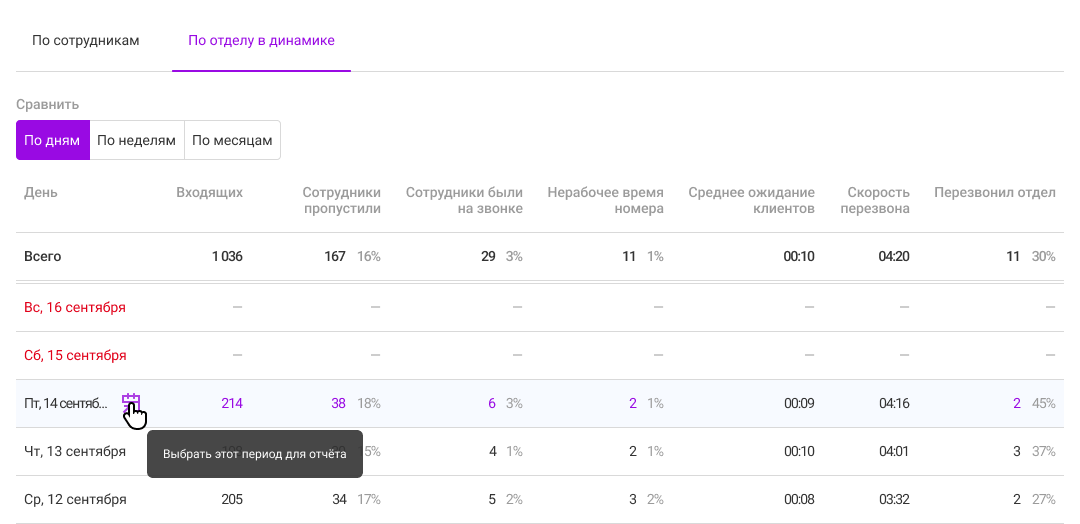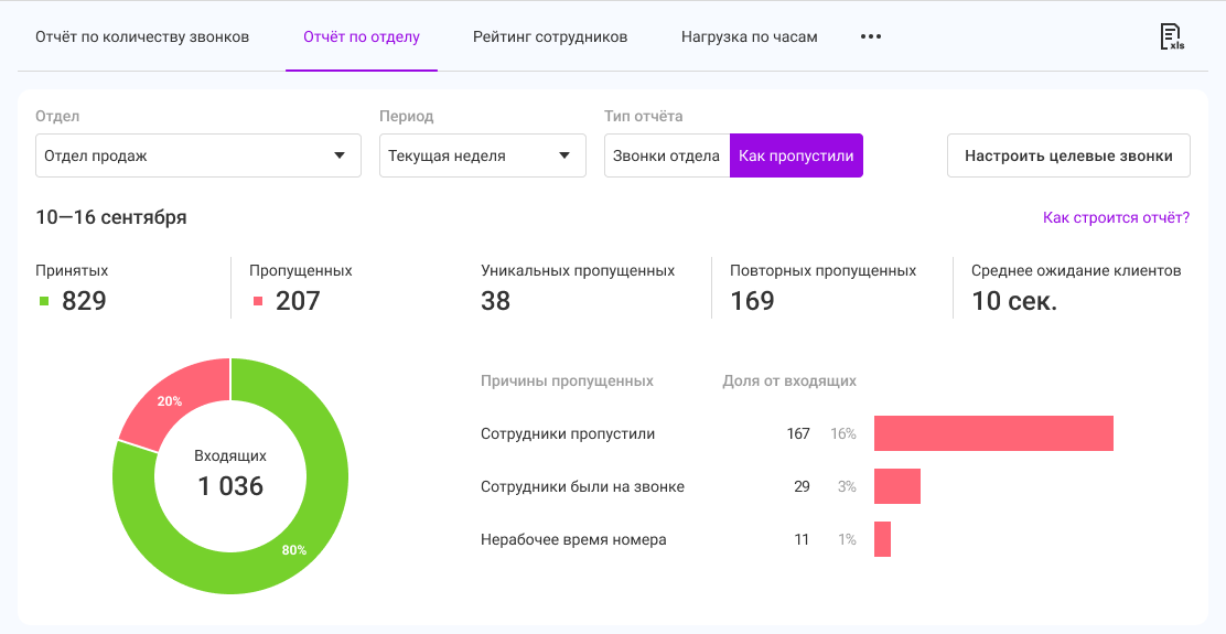 • разбираться, почему звонки в отдел остались без ответа и кто из сотрудников чаще их пропускает.