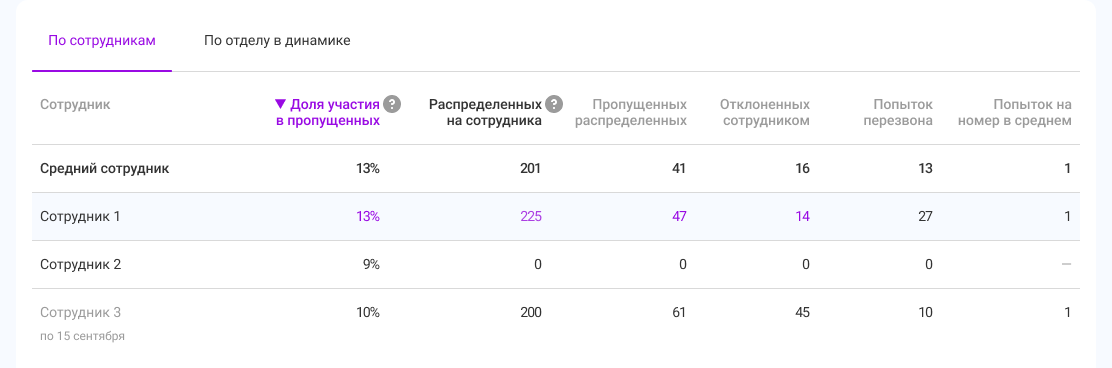 • Пропущенных звонков, распределенных на сотрудника — как часто сотрудник пропускает распределенные на него звонки. Возможно, доля участия в пропущенных отделом высокая, потому что таких звонков в целом немного, но при этом сотрудник редко пропускает звонки;