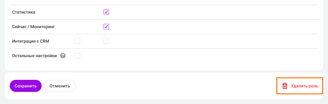 • Интеграция с CRM — можно настроить доступ для просмотра или редактирования настроек интеграций CRM.