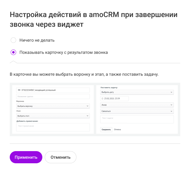 Чтобы по завершении вызова в amoCRM всегда отображалась карточка с результатами звонками, в открывшемся окне выберите «Показывать карточку с результатом звонка».