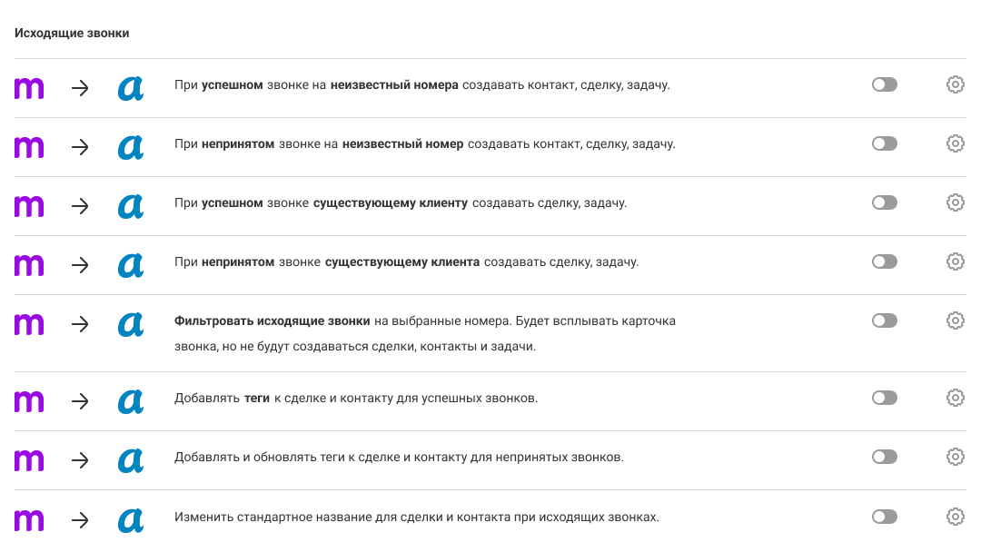 6. Настройте сценарии интеграции amoCRM и АТС. Некоторые сценарии интеграции подключаются автоматически без возможности внести в них изменения. Вы можете настроить сценарии интеграции для входящих и исходящих звонков по разным событиям. Например, добавлять теги для успешных и непринятых вызовов. Теги фиксируют важные детали каждого звонка в карточках сделок и контактов. Подробнее о настройке тегов в статье.