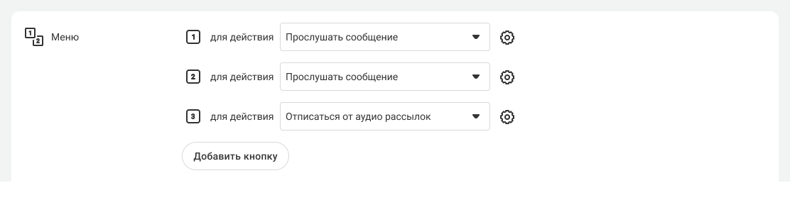 - Отписаться от аудио рассылок – после нажатия кнопки клиент будет добавлен в список отписавшихся и перестанет получать звонки по заданиям автоинформирования. Загрузите или создайте с помощью функции «Синтез речи» в АТС аудиосообщение, которое услышит клиент, нажав на эту кнопку.