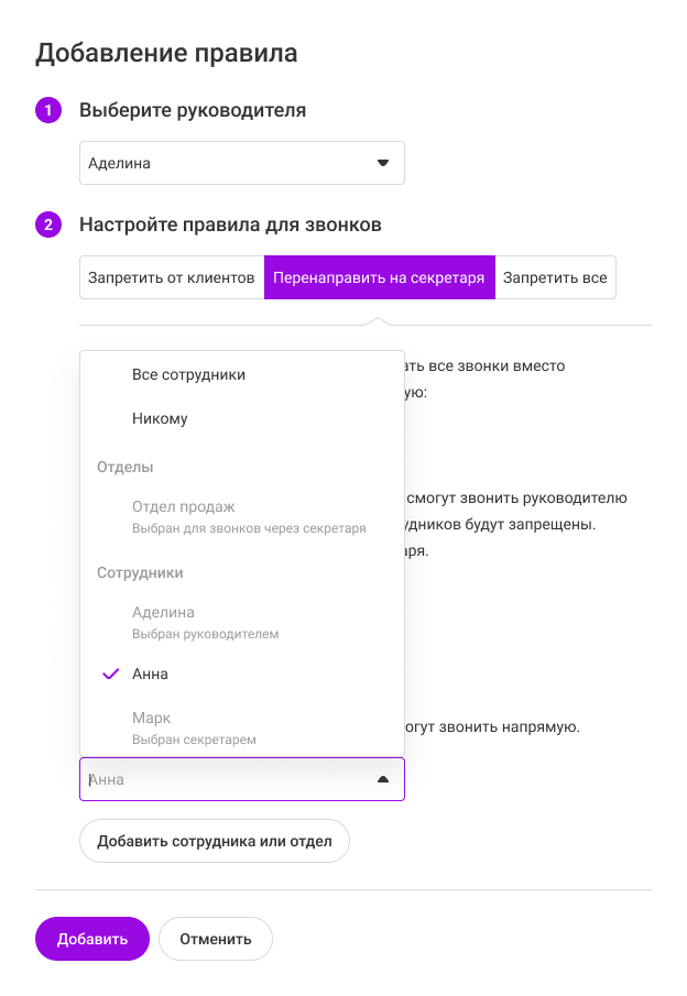 Затем выберите отделы и сотрудников, которые смогут звонить руководителю через секретаря — звонки от остальных сотрудников будут запрещены.