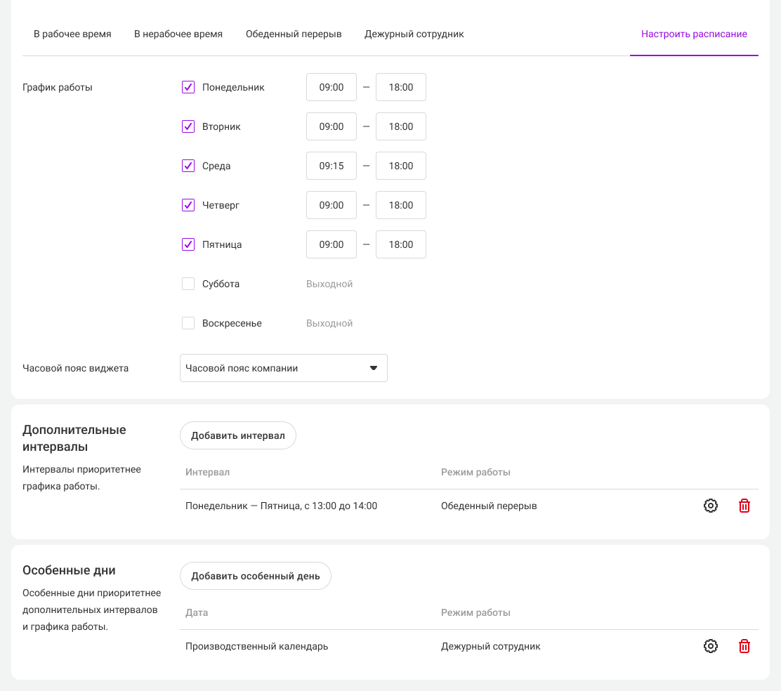 Настройки расписания виджета обладают такими же возможностями, как и настройки расписания номера. Поэтому, чтобы настроить виджет в соответствии с вашим графиком, рекомендуем изучить статью «Гибкая настройка расписания для номера».