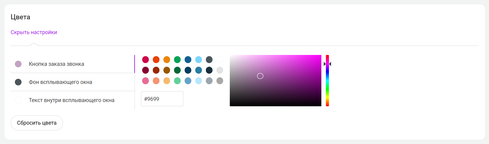 Выберите цвет кнопки заказа звонка, фона всплывающего окна и текста внутри него. Вы можете подобрать цвета таким образом, чтобы они соответствовали вашему фирменному стилю или сделали виджет еще заметнее на страницах вашего сайта.