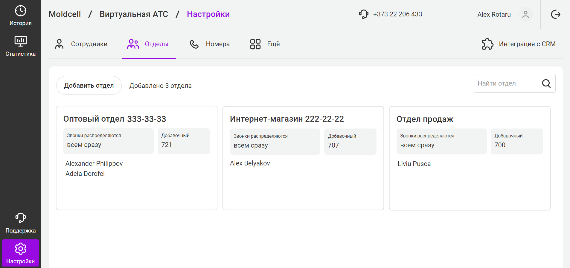 В данном случае вместо «Отдел продаж 495 000-00-00» будет отображаться номер или название отдела, созданные вами в Виртуальной АТС Moldcell.