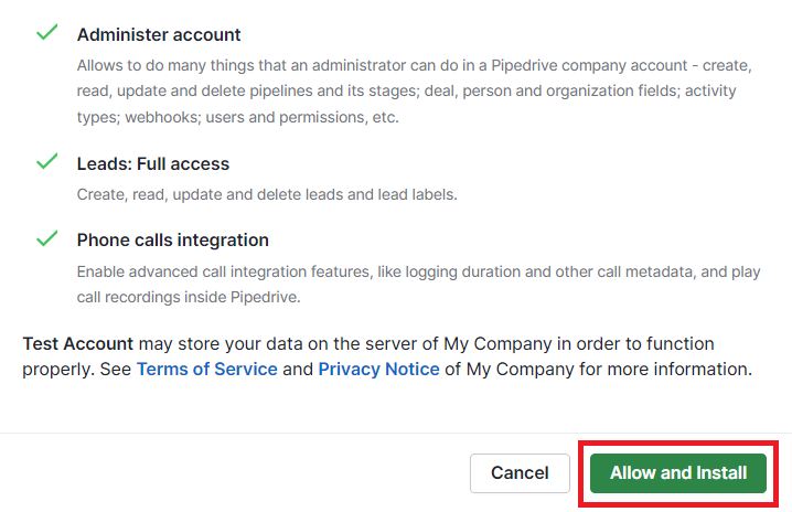 Прокрутите список до конца. Чтобы разрешить АТС доступ к Pipedrive и установить интеграцию, нажмите на кнопку «Allow and Install» («Разрешить и установить»).