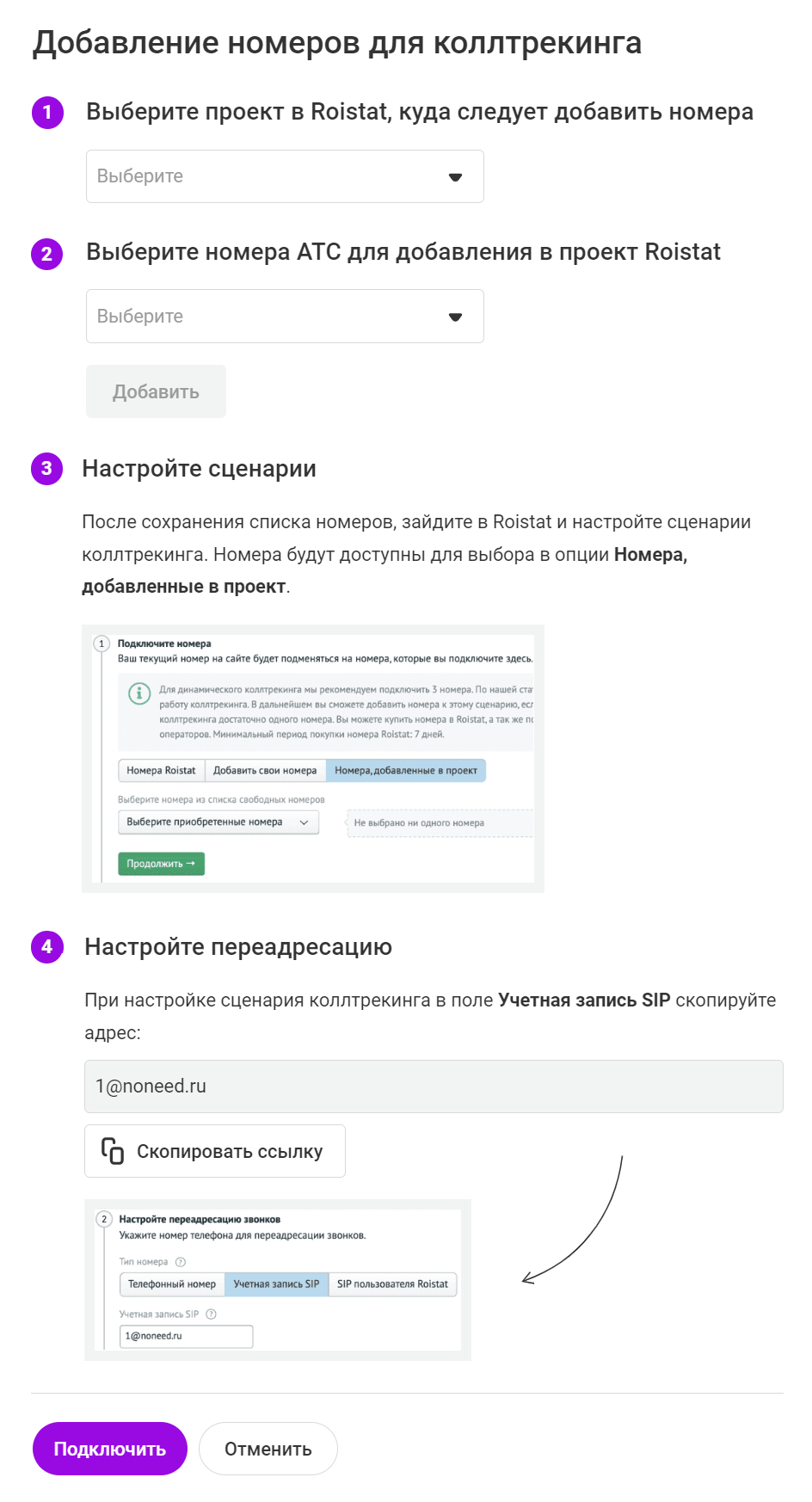 4. Перейдите в Roistat, выберите ваш проект, в раздел «Коллтрекинг» → «Сценарии».