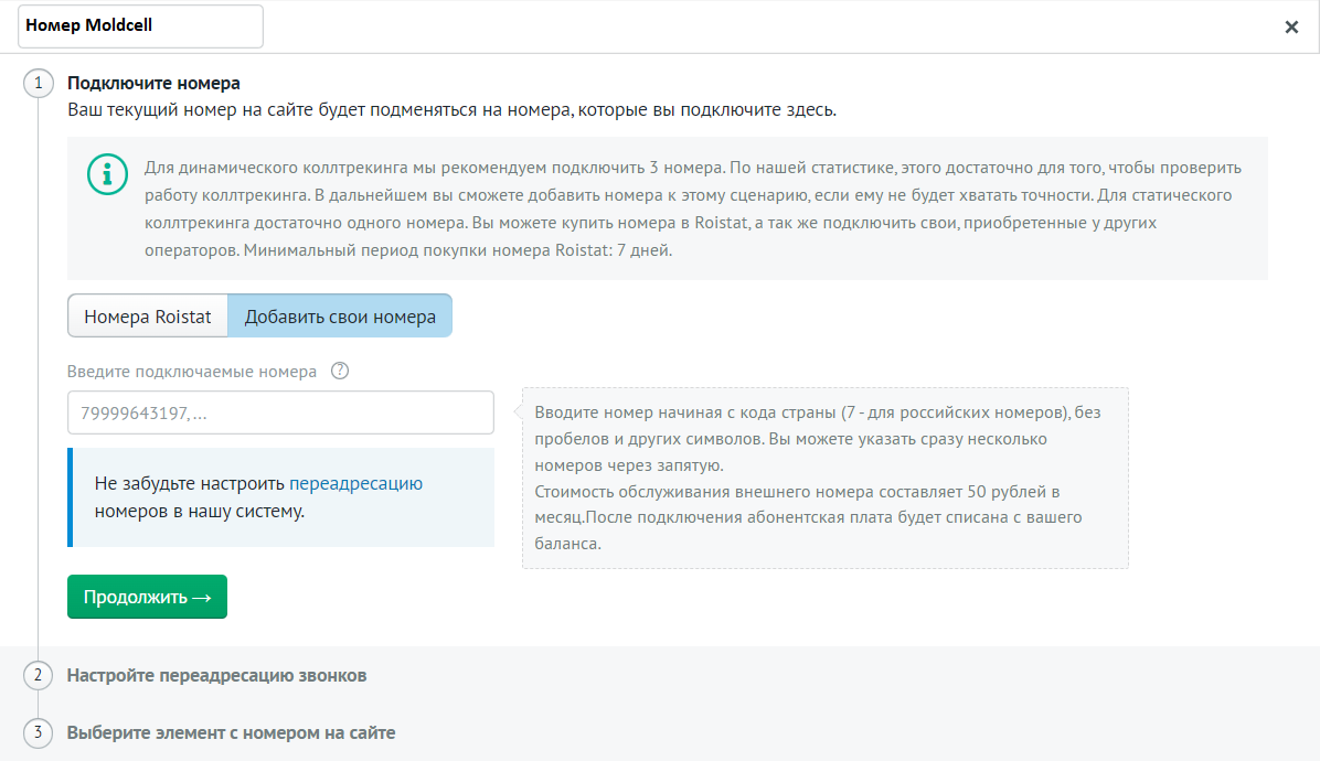 Готово! Теперь все звонки на номер Moldcell будут отправляться в Roistat для анализа. Оставшиеся номера вы можете добавить точно таким же образом.