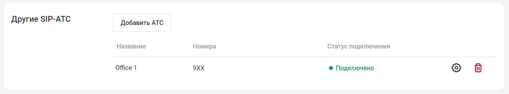 После того как настройки будут произведены, статус подключения SIP-АТС в личном кабинете Виртуальной АТС изменится на «Подключено» и будет отмечен зеленым индикатором. Это значит, что теперь вам доступны звонки по коротким номерам между пользователями ВАТС и подключенной SIP-АТС.