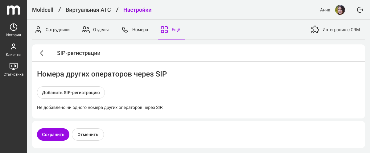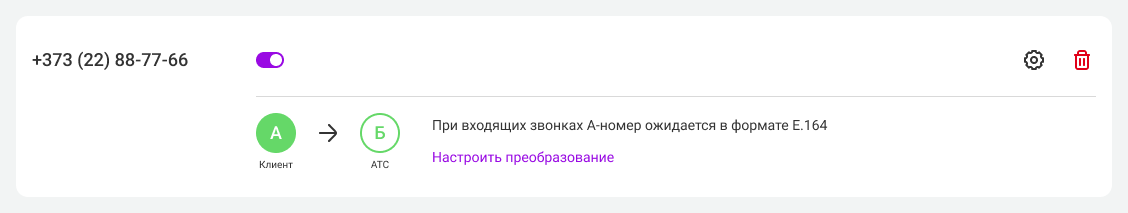 Также в настройках номера будет раздел «При входящих звонках А-номер ожидается в формате E.164». Это техническая информация и, чаще всего, сюда вносить изменения не требуется. Если ваш оператор связи работает не по стандарту E.164, здесь вы сможете настроить преобразование.