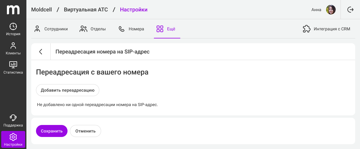 1. В разделе «Еще» перейдите в «Переадресация номера на SIP-адрес» и в разделе нажмите «Добавить переадресацию».